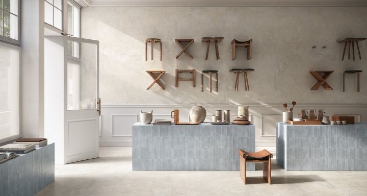 Effetti Legno, marmo, metallo, pietra, cemento/resina e grandi lastre arricchiscono la collezione disponibile in vari formati.