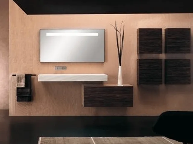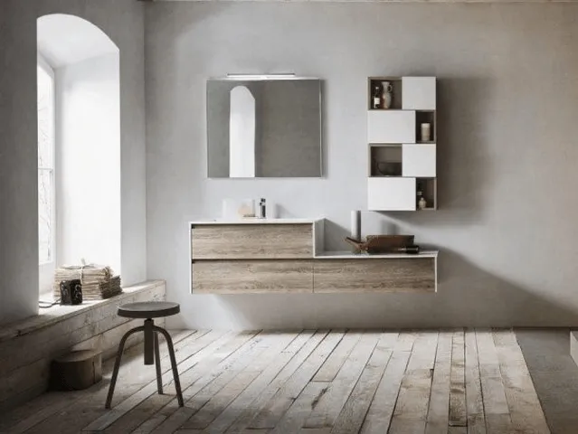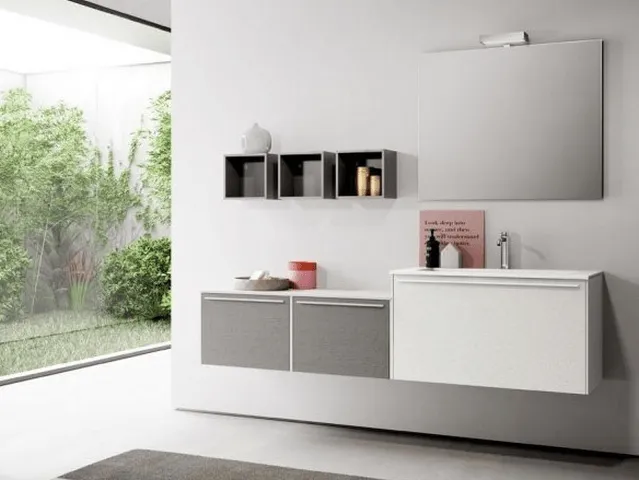 Ogni serie dispone di specchiere, specchiere contenitore, colonne, pensili, cassettiere e panche in tinta di varie misure e profondità.